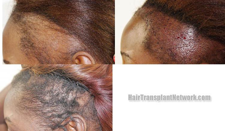 This 33 year old female african american had 2091 FUT grafts transplanted in the frontal and temporal areas in one session. The photos show before, immediate post-op, and 9 months post-op. The patient is extremely pleased with results.