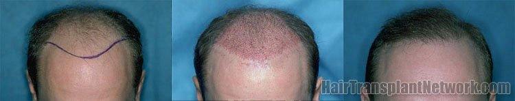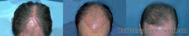 Bernstein Medical - Center for Hair Restoration patient JIH had 4 scalp reductions that resulted in a significant Y-shaped deformity on the top of his head, a partially depleted donor supply, and a tight scalp. This makes future hair transplantation procedures difficult by limiting the total number of grafts that can be transplanted. The “After” photo shows the results of one hair transplant session of 1,825 follicular unit grafts. A second procedure is planned to add more density.
